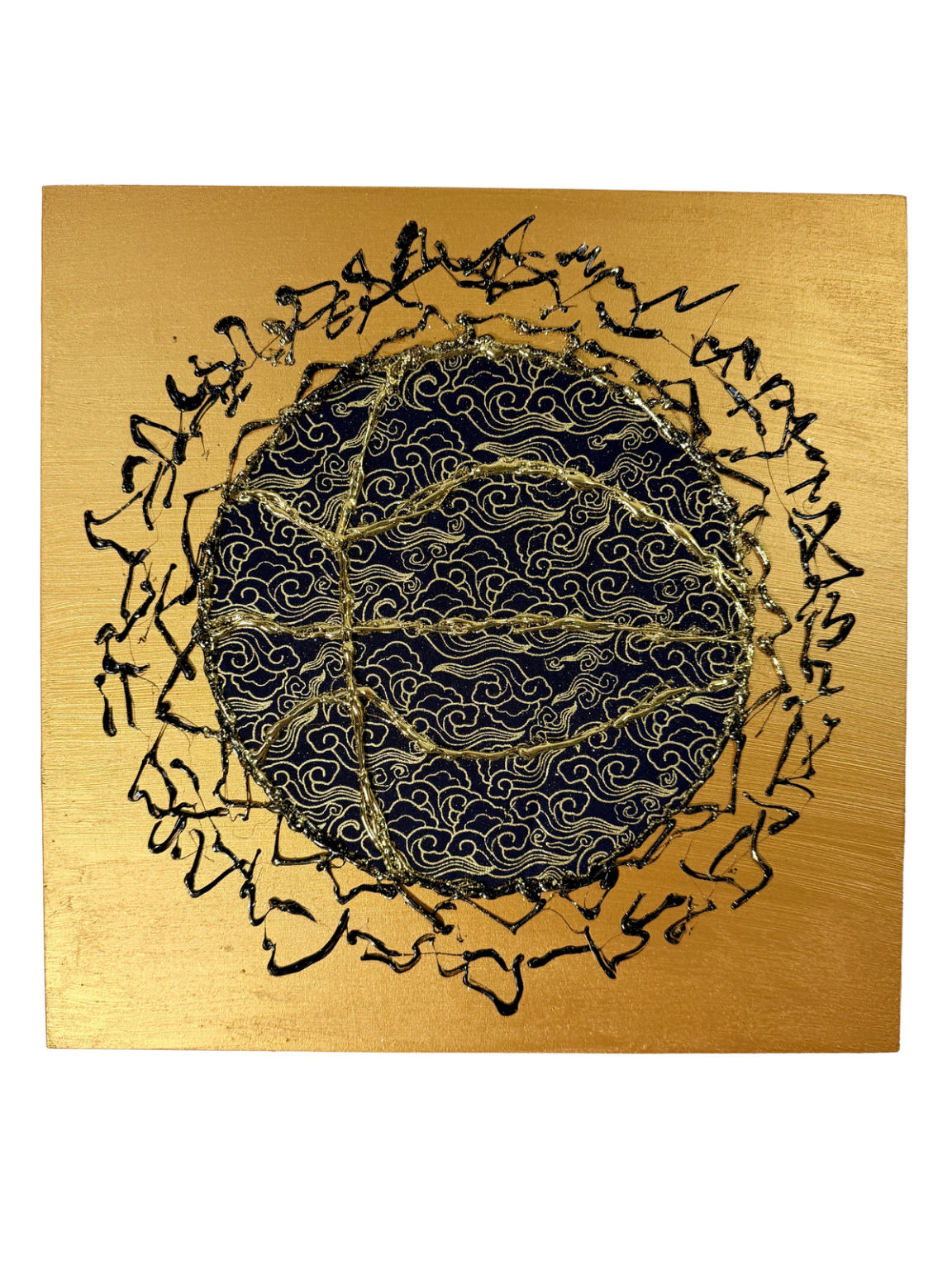 - 木製パネルをベースに、アクリル絵の具(ジェッソ)と金箔を何層にも重ね、さらにグルーガンで立体的なテクスチャ(質感)を加えたミクストメディア作品です。中央にはアクセントとして、日本の伝統的な着物柄の素材が組み込まれています。