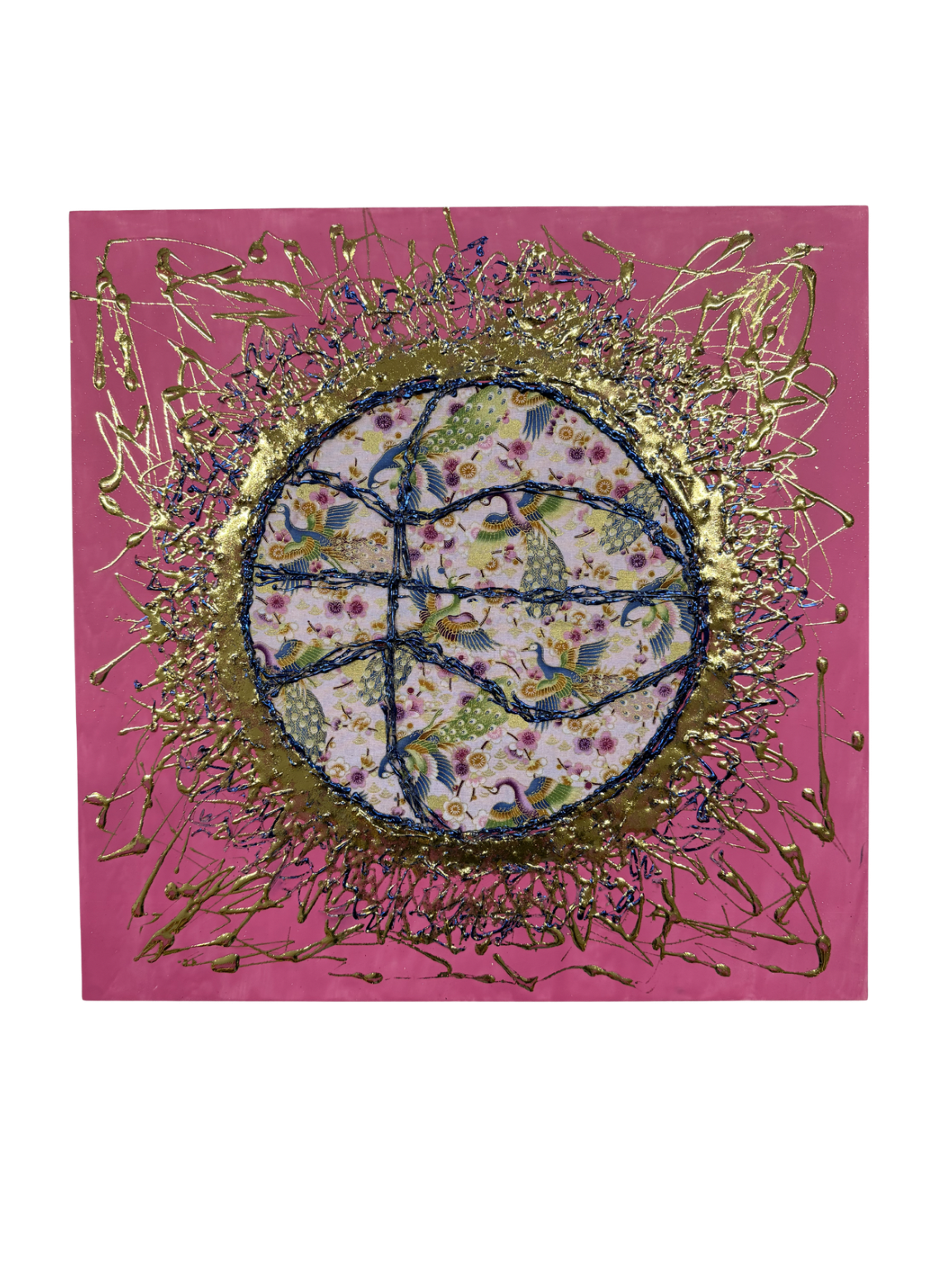 - 木製パネルをベースに、アクリル絵の具(ジェッソ)と金箔を何層にも重ね、さらにグルーガンで立体的なテクスチャ(質感)を加えたミクストメディア作品です。中央にはアクセントとして、日本の伝統的な着物柄の素材が組み込まれています。