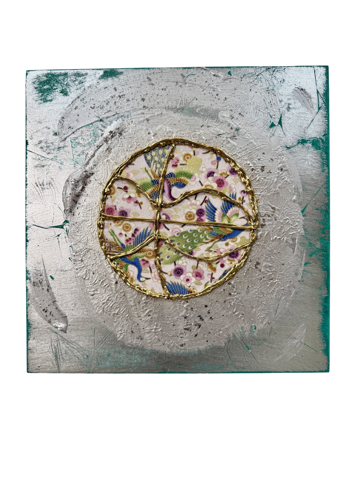 - 木製パネルをベースに、アクリル絵の具(ジェッソ)と金箔を何層にも重ね、さらにグルーガンで立体的なテクスチャ(質感)を加えたミクストメディア作品です。中央にはアクセントとして、日本の伝統的な着物柄の素材が組み込まれています。