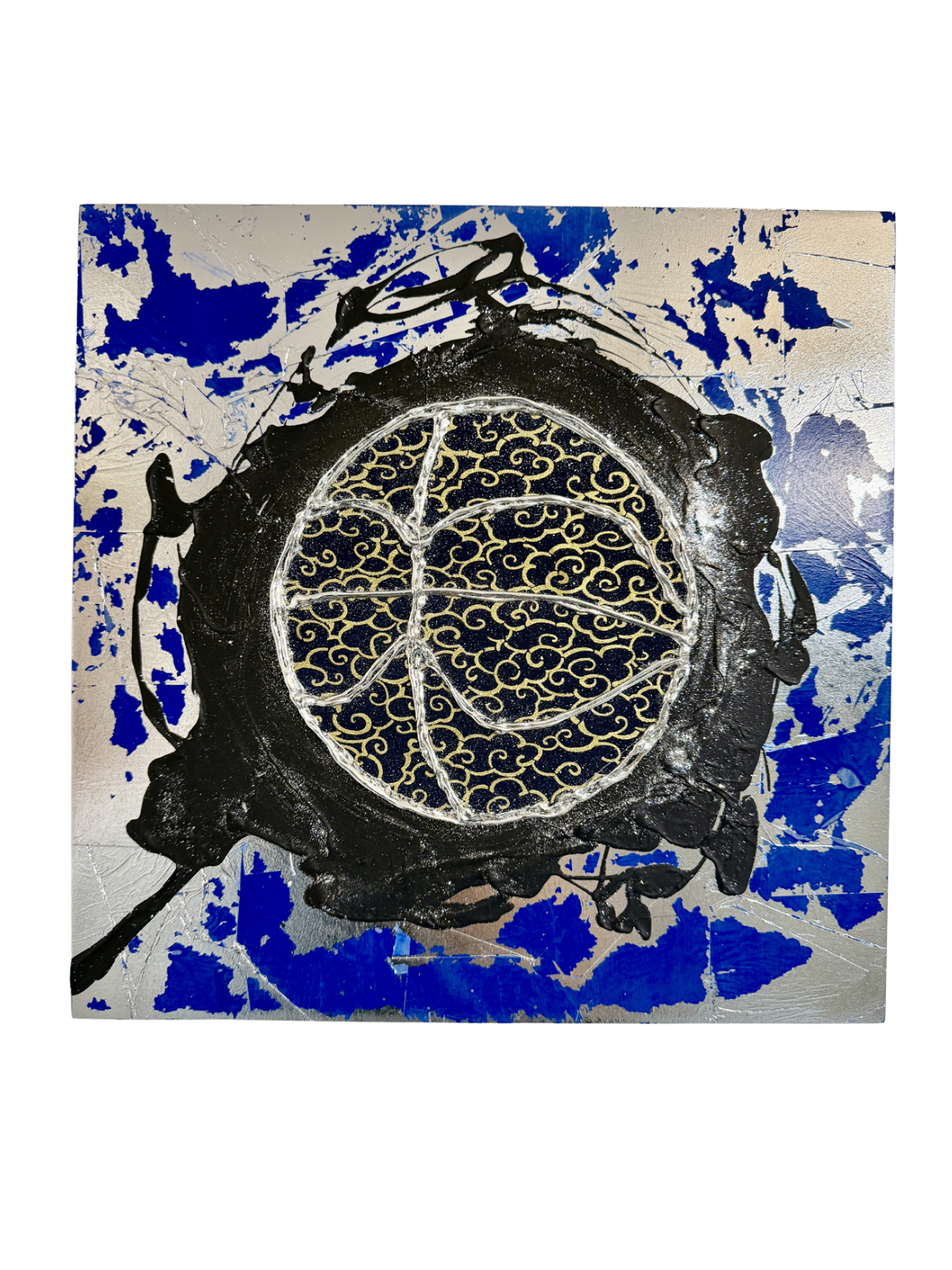 - 木製パネルをベースに、アクリル絵の具(ジェッソ)と金箔を何層にも重ね、さらにグルーガンで立体的なテクスチャ(質感)を加えたミクストメディア作品です。中央にはアクセントとして、日本の伝統的な着物柄の素材が組み込まれています。
